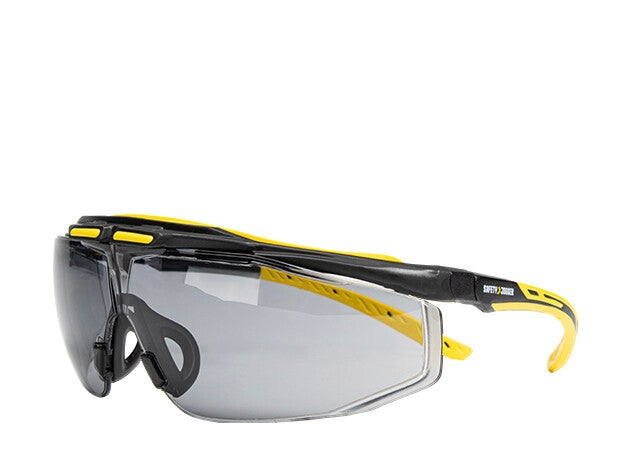 Een veiligheidszonnebril met een verlengd oogscherm,