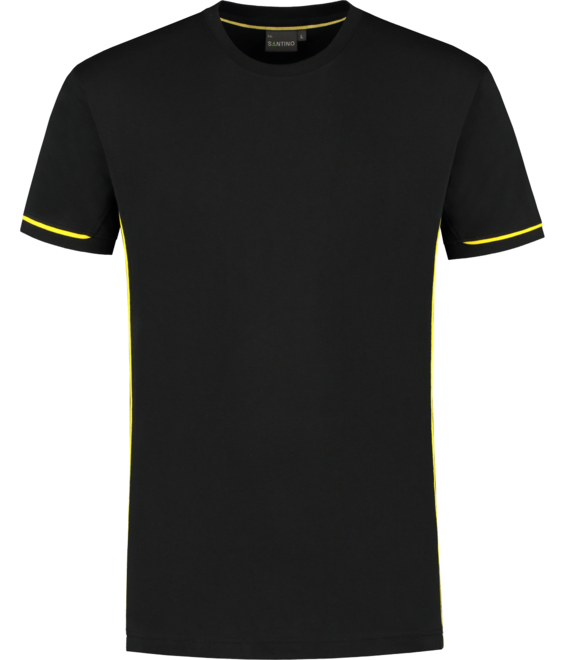 T-shirt, 80% organisch katoen / 20% gerecycled polyester, GOTS gecertificeerd, 180 gr/m2, single jersey, unisex, modern fit, contrast piping, ronde hals en mouw met 1x1 ribboord. 3D Santino logo transfer op onderzijde